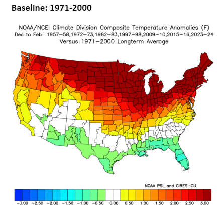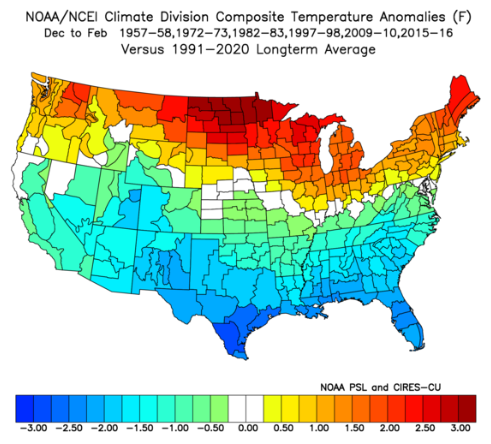 So the big difference was South and West was both warmer than typical strong Nino’s. That’s what made this year so potent. In the warming world we are seeing due to climate change it’s more notable that this is compared to the last 30 years because the previous decades were colder. So, if we look at 1971-2000 averages then it’s even more extreme how hot a strong El Nino can be for America.