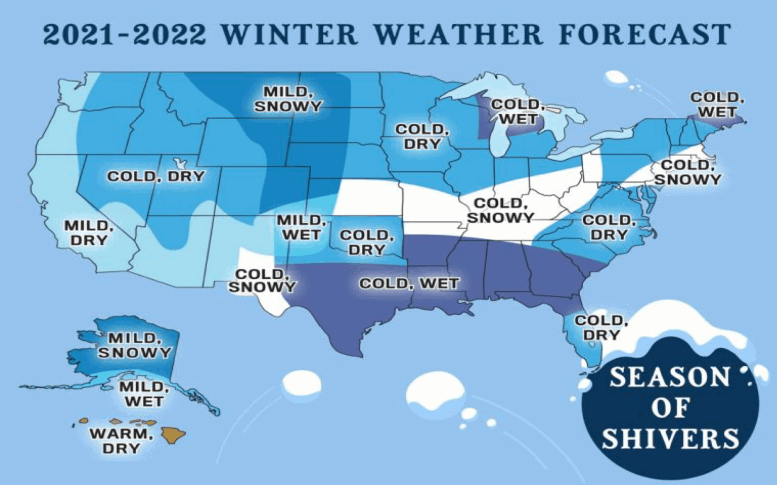 The OG of the almanac rivalry brings in the cold. Brrrrrr according to almanac.com “A season of shivers is predicted for the US.” The super cold prediction could be one of the worst in several years. Widespread nippy conditions and some above snow areas are a common sight.