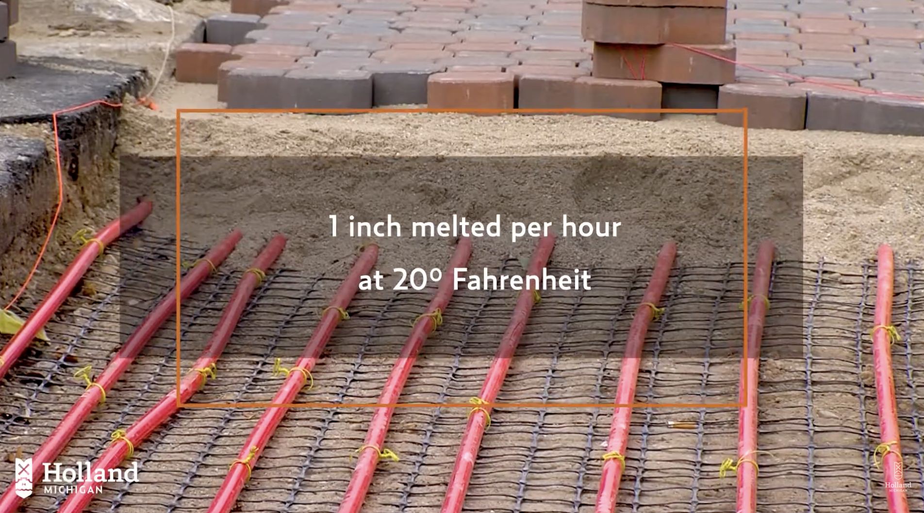 Rather than relying on traditional snow management during storm events, Holland uses a closed loop hydronic system that circulates hot water at about 95°F through tubing laid under surfaces. The heat melts up to 1 inch of snow per hour even in 20°F weather with wind.