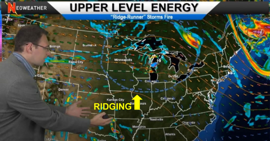 The key weather term of the week is “ridging.” The big area of ridging in the Midwest means the weather starts off quiet this week, with high pressure that keeps skies relatively sunny in most of the country. Then the troughing on the edges of that ridging can cook up some nasty storms. That’s what we’re likely to see this week…. storms popping up on the edges of the ridging. All the action and energy this week is north of the ridging.